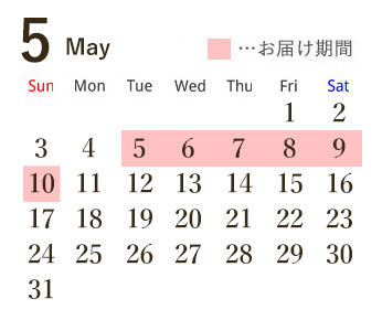5/5(火)~5/10(日) いずれかの日にちにお届け致します ※お届け日・時間帯のご指定は承っておりません。