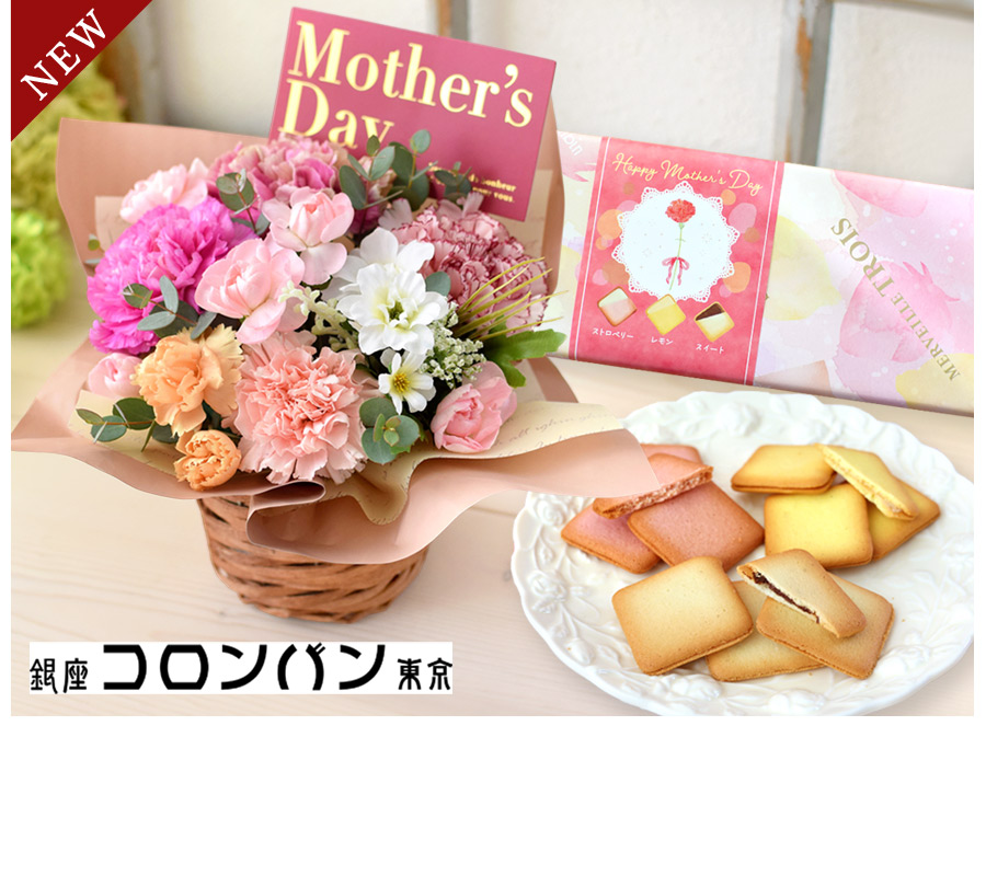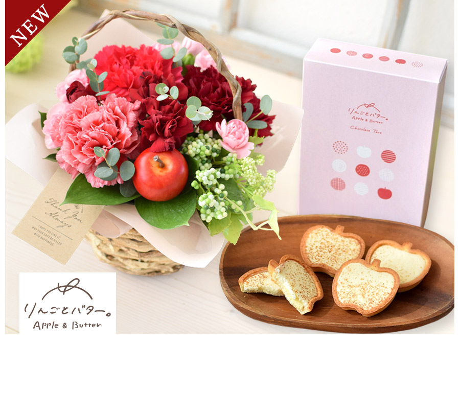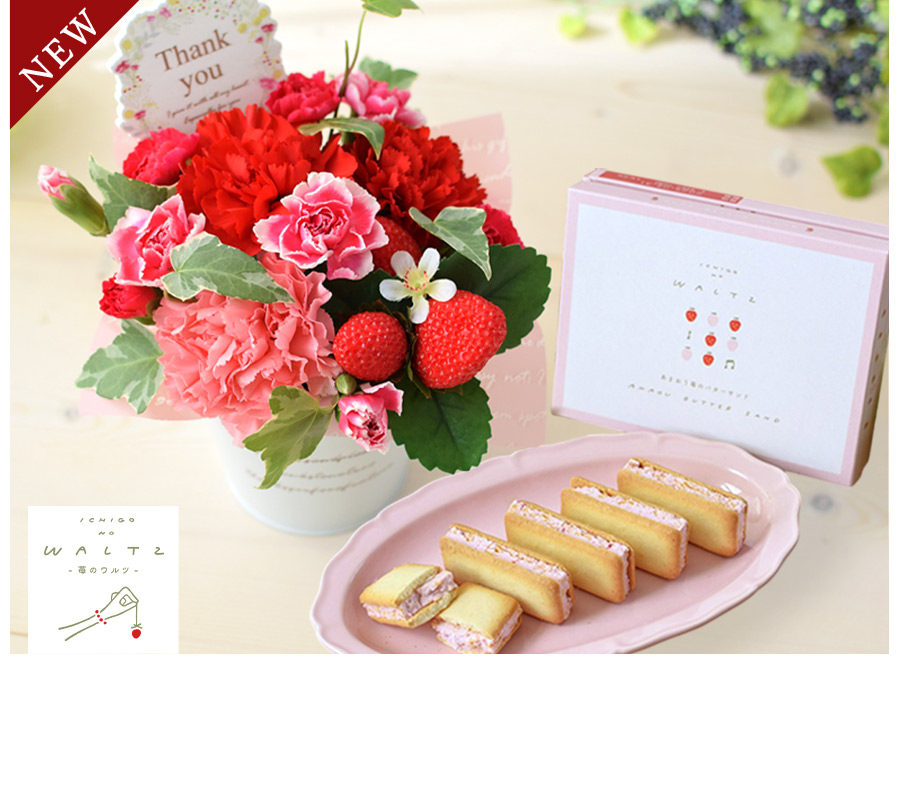 カーネーションを大人可愛い色合いでまとめ、お母さんのイメージを生花アレンジで表現しました。サクサクとした食感が魅力のあまおうバターサンドとのセット♪
