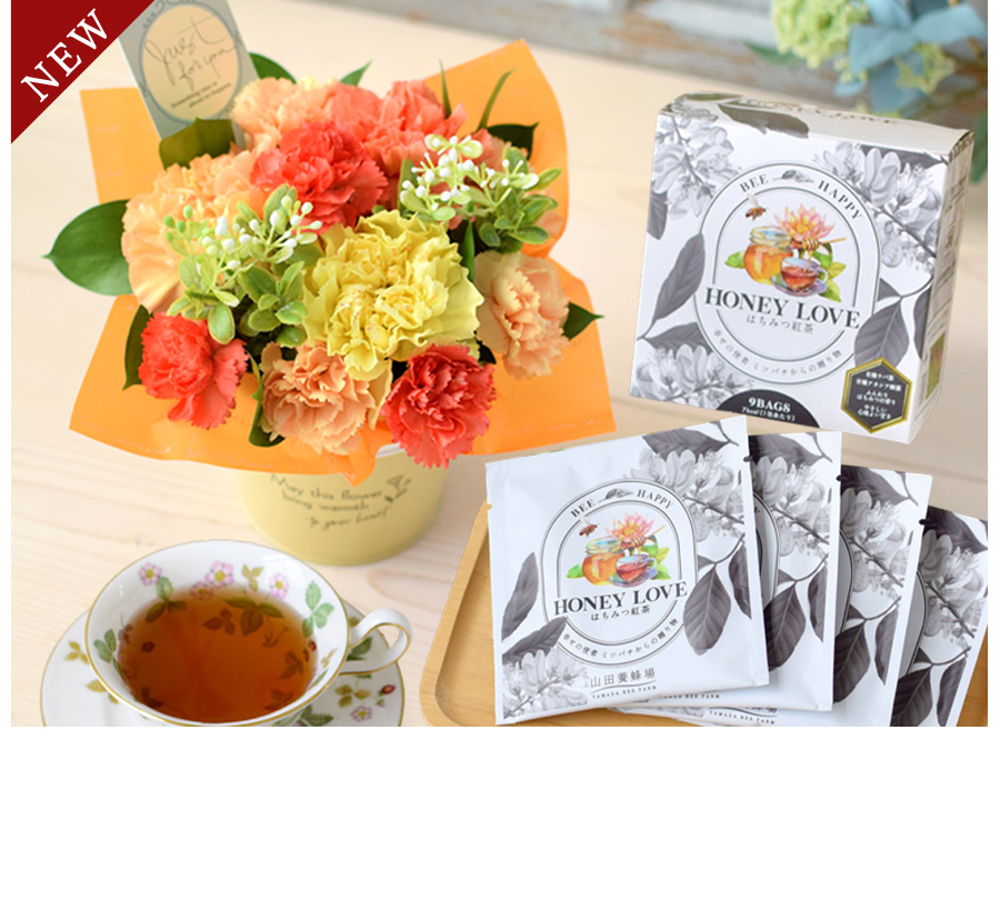 オレンジや黄色のカーネーションを使い、笑顔が輝くお母さんのイメージを生花アレンジで表現しました。幸せの使者ミツバチからの贈り物、はちみつ紅茶とのセット♪